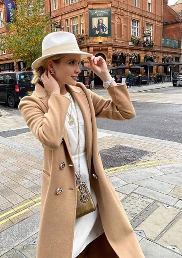 На прогулку по Лондону дочка эстрадного исполнителя отправилась в шляпке, которую девушка подобрала к песочному тренчу и белой тунике. Образ Устиньи дополнили аксессуары, в виде подвески с кулоном и золотистая сумочка на цепочке, а также люксовые часы.